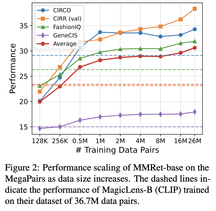 MegaPairs showcases scalability: MMRet-base improves as training data increases. It also demonstrates efficiency: with just 0.5M training samples, MMRet-base significantly outperforms MagicLens, which uses the same CLIP-base backbone and was trained on 36.7M samples.