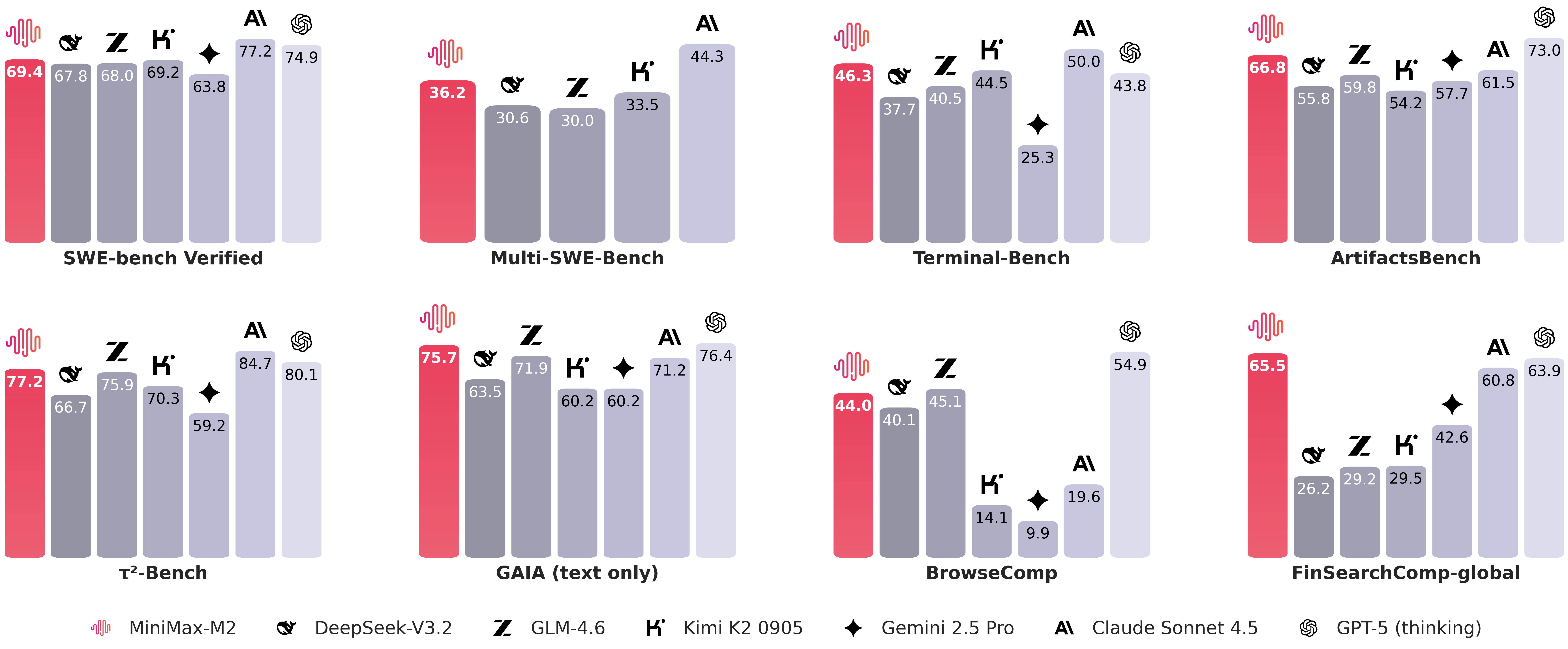 | **Benchmark** | **MiniMax-M2** | **Claude Sonnet 4** | **Claude Sonnet 4.5** | **Gemini 2.5 Pro** | **GPT-5 (thinking)** | **GLM-4.6** | **Kimi K2 0905** | **DeepSeek-V3.2** |