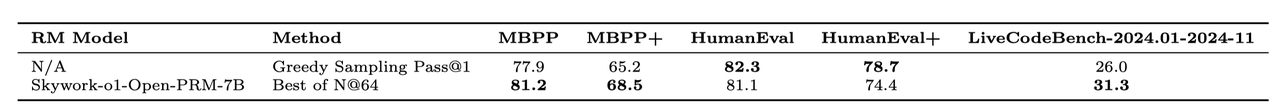 - Skywork o1 Open-PRM-Qwen2.5-1.5B: Achieves the performance of 8B models, competing with advanced models like RLHFlow's Llama3.1-8B-PRM-Deepseek-Data and OpenR's Math-psa-7B.