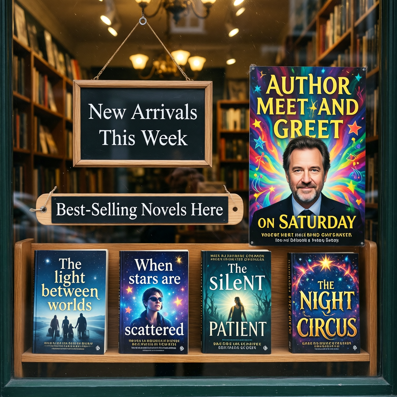 | Bookstore window display. A sign displays “New Arrivals This Week”. Below, a shelf tag with the text “Best-Selling Novels Here”. To the side, a colorful poster advertises “Author Meet And Greet on Saturday” with a central portrait of the author. There are four books on the bookshelf, namely “The light between worlds” “When stars are scattered” “The slient patient” “The night circus” |