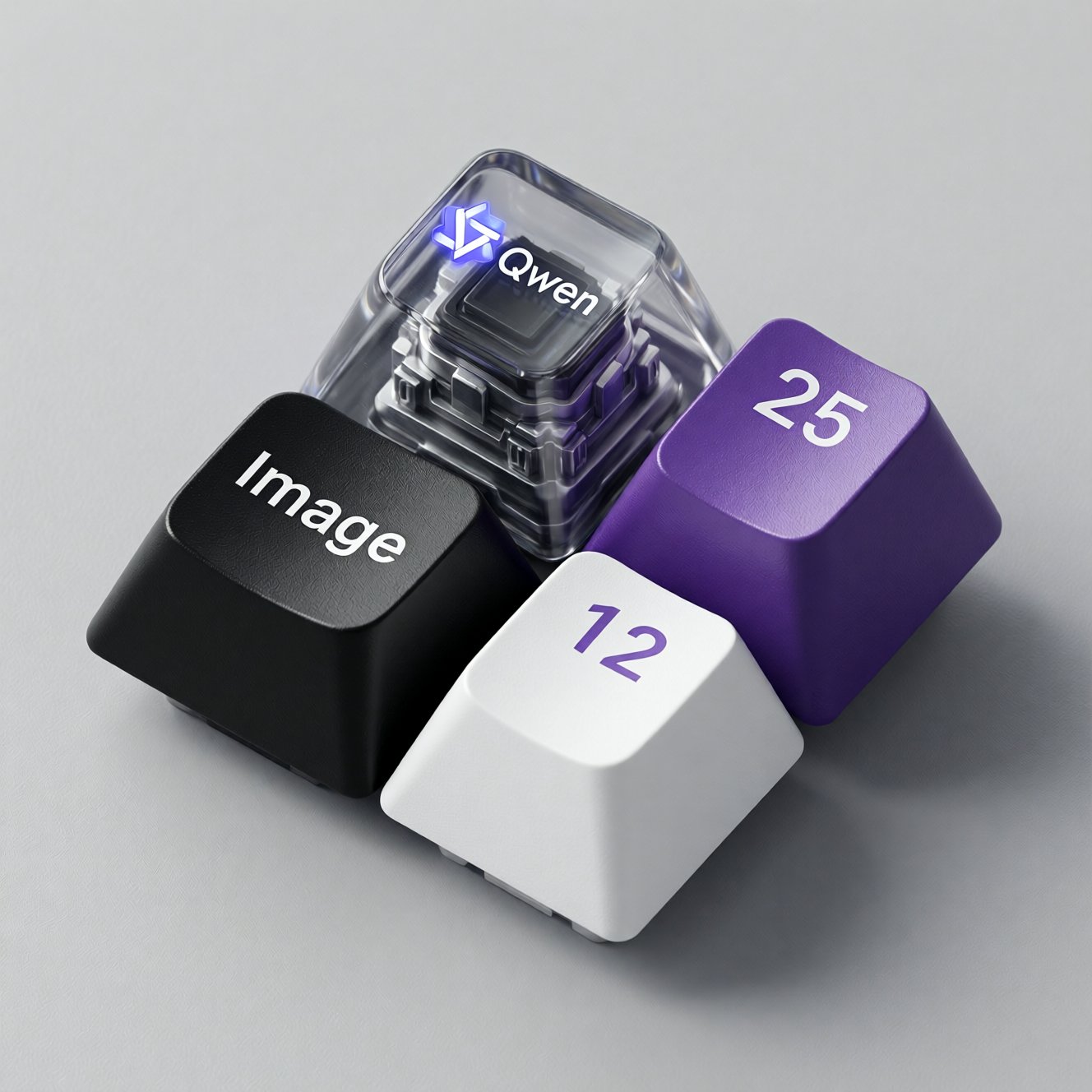 | ultra-realistic 3D render of four mechanical keyboard keycaps in a tight 2x2 grid, all keys touching. View from an isometric angle. One key is transparent with the word “Qwen” printed in white key. The other three colors are: black, purple, and white. The black key says the white “Image” . The other two say “25” and “12”. Realistic plastic texture, rounded sculpted keycaps, soft shadows, clean light-gray background. |