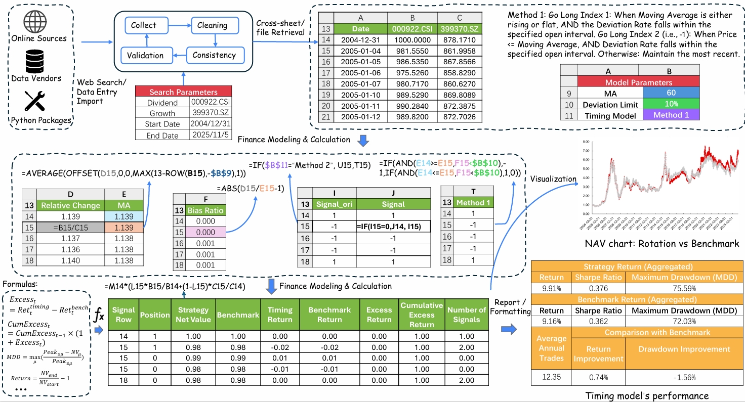 - Deriving concrete workflow instances by analyzing changes across spreadsheet versions (15,000 versioned spreadsheet files from Enron and EUSES) and designing workflows based on high-quality artifacts from investment and securities companies, World Bank, Canadian/British government agencies, WideSearch, Dabstep, and more.