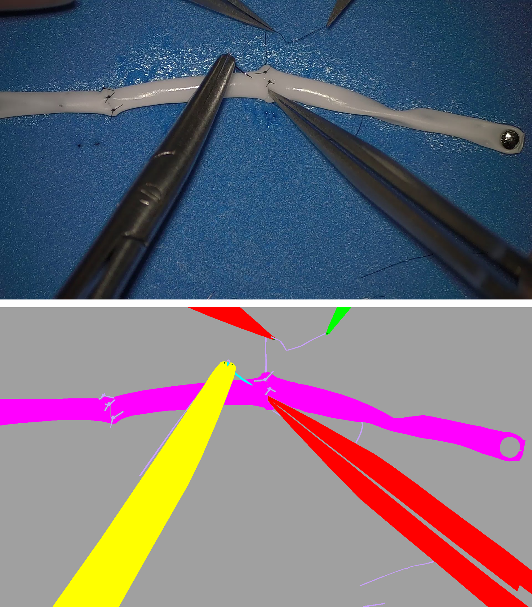 Class ID Class Name RGB Color 0 forceps (253, 0, 26) 1 scissors (43, 253, 62) 2 vascular_clamps (0, 43, 249) 3 needle_holder (255, 253, 66) 4 vessel (253, 40, 250) 5 needle (38, 255, 254) 6 thread (198, 161, 251)