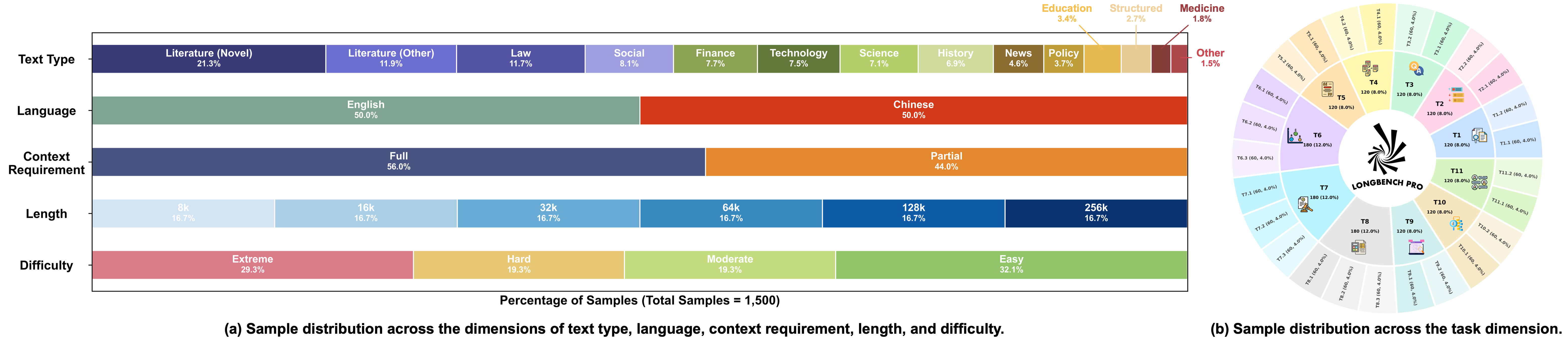 LongBench-Pro, containing 1,500 samples, is entirely built on authentic, natural long documents and includes 11 primary tasks and 25 secondary tasks, covering all long-context capabilities assessed by existing benchmarks. It employs diverse evaluation metrics, enabling a more fine-grained measurement of model abilities, and provides a balanced set of bilingual samples in both English and Chinese.