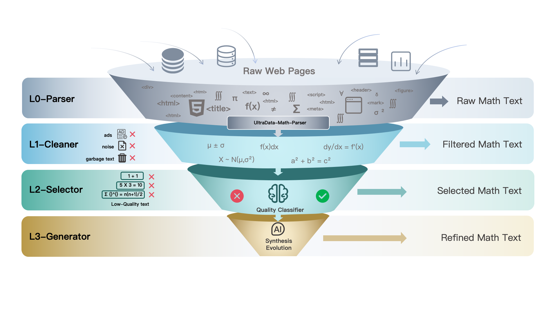 To break through the limitations of existing mathematical datasets in quality and diversity, we established a refined grading standard centered on "mathematical content integrity" and "information density". UltraData-Math adopts the L0-L4 Tiered Data Management Framework proposed by the UltraData paper. Through standardized level definitions, it achieves orderly management and efficient flow of mathematical data assets. Each level represents higher data purity and mathematical value, while also corresponding to a more refined degree of processing.