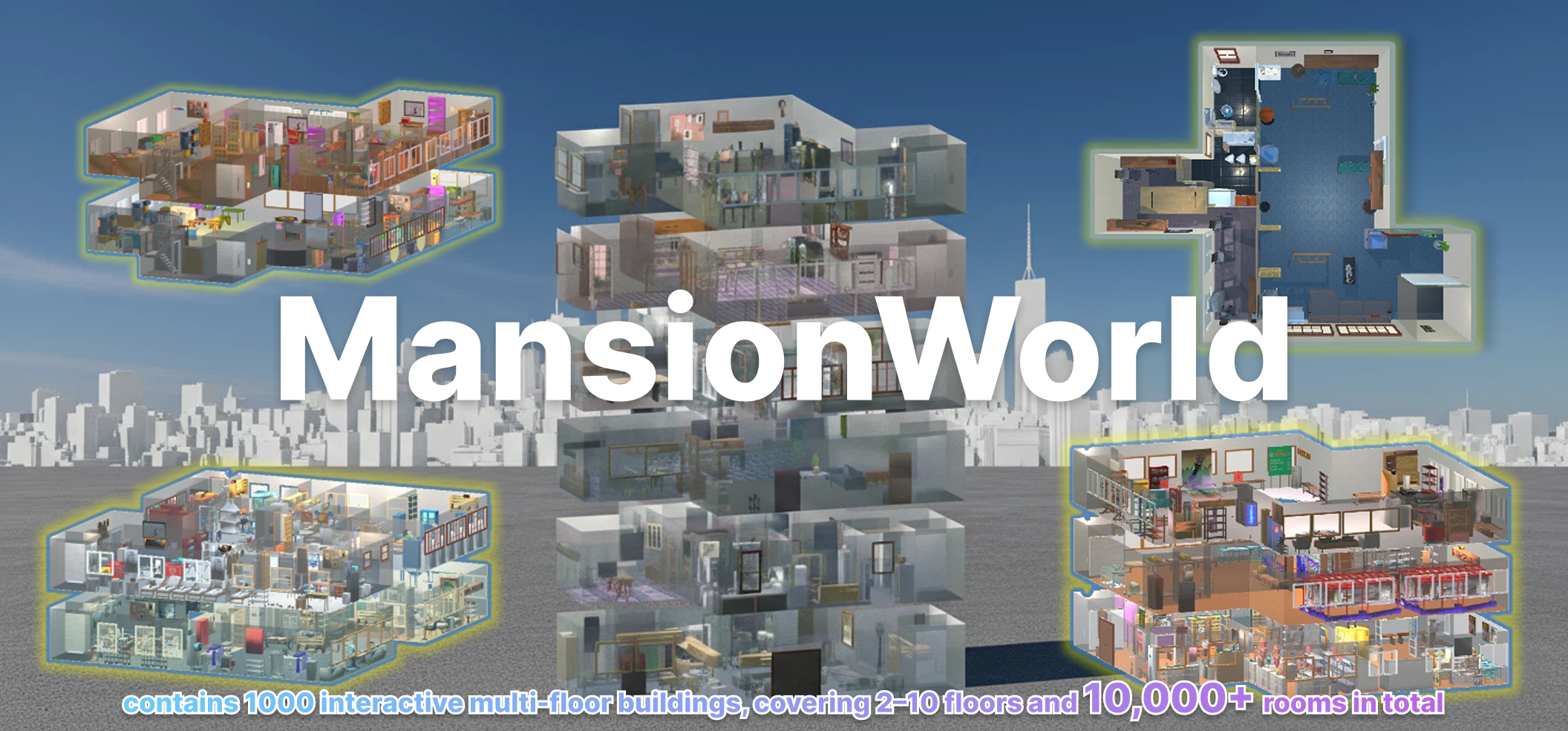 MansionWorld is a large-scale multi-floor indoor scene dataset for embodied AI research, built on top of the AI2-THOR simulator.