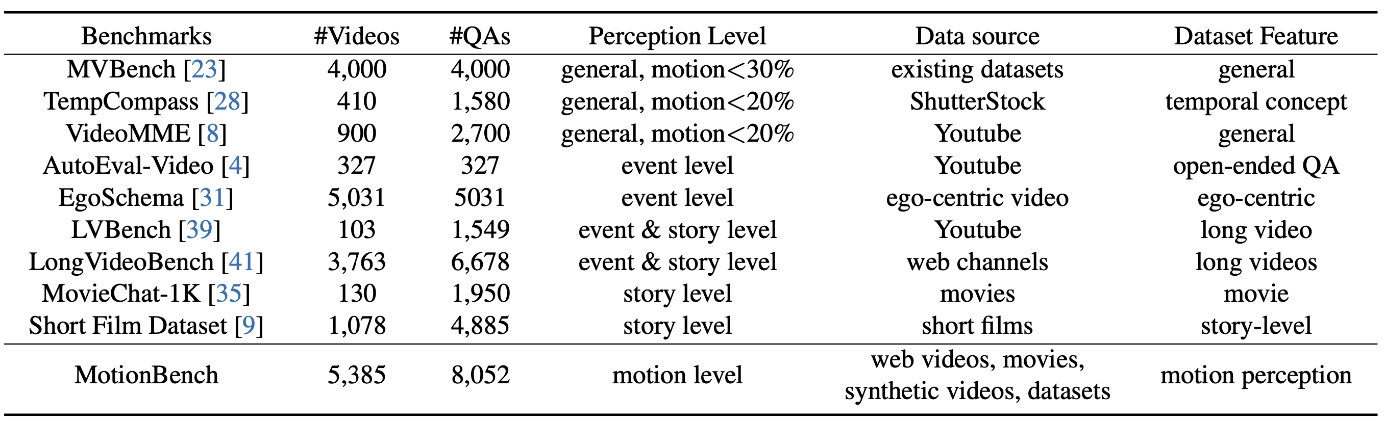 - Diverse Data: MotionBench collects diverse video from the web, public datasets, and self-synthetic videos generated via Unity3, capturing a broad distribution of real-world application.