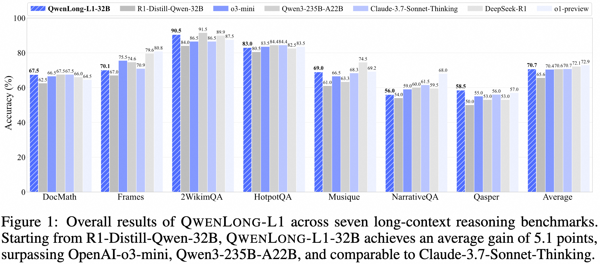 May 26, 2025: 🔥 We release 🤗 QwenLong-L1-32B, which is the first long-context LRM trained with reinforcement learning for long-context reasoning. Experiments on seven long-context DocQA benchmarks demonstrate that QwenLong-L1-32B outperforms flagship LRMs like OpenAI-o3-mini and Qwen3-235B-A22B, achieving performance on par with Claude-3.7-Sonnet-Thinking, demonstrating leading performance among state-of-the-art LRMs.