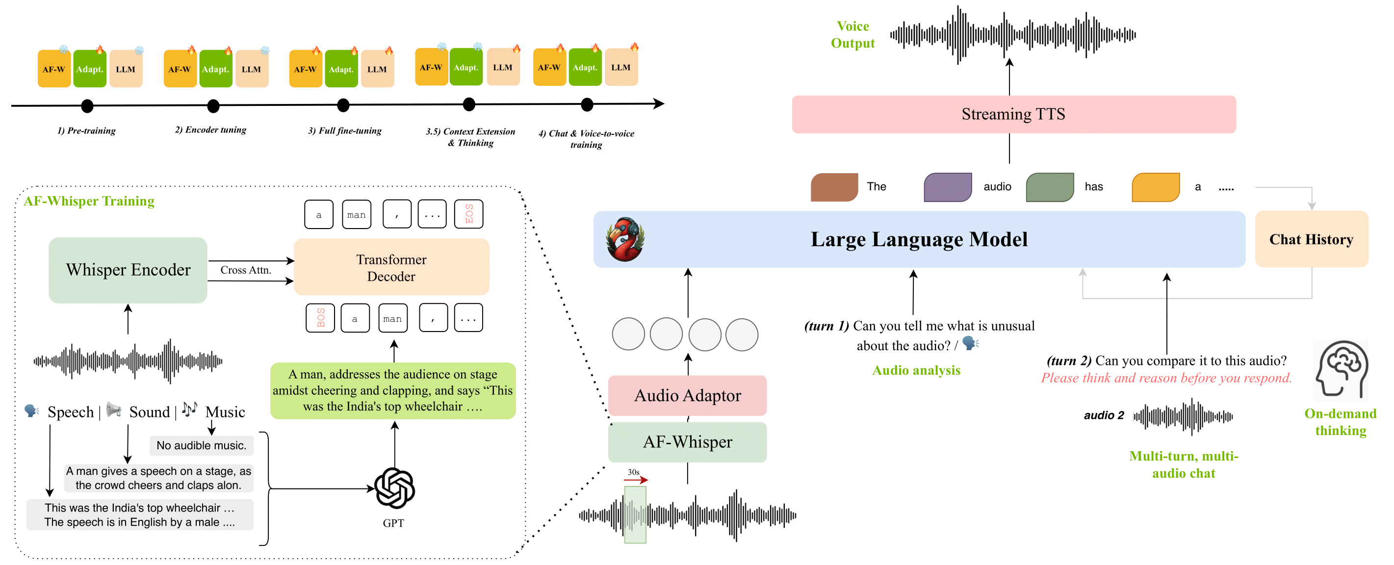 - Multi-turn, multi-audio conversational dialogue (AF3-Chat)