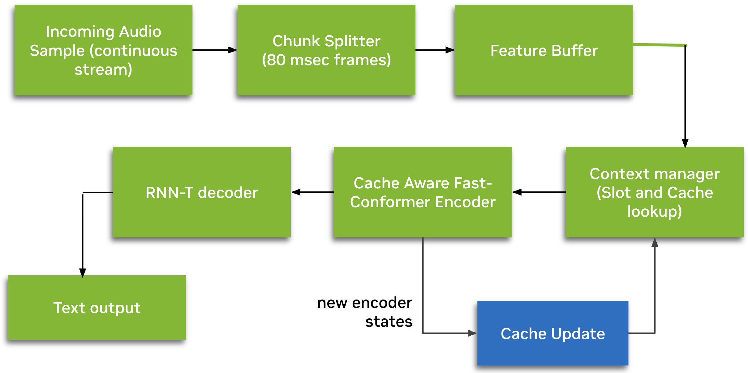 By leveraging the state-of-the-art Cache-Aware FastConformer-RNNT architecture, the model eliminates redundant overlapping computations common in traditional "buffered" streaming. This allows it to process only new audio chunks while reusing cached encoder context, significantly improving computational efficiency and minimizing end-to-end delay without sacrificing accuracy.
