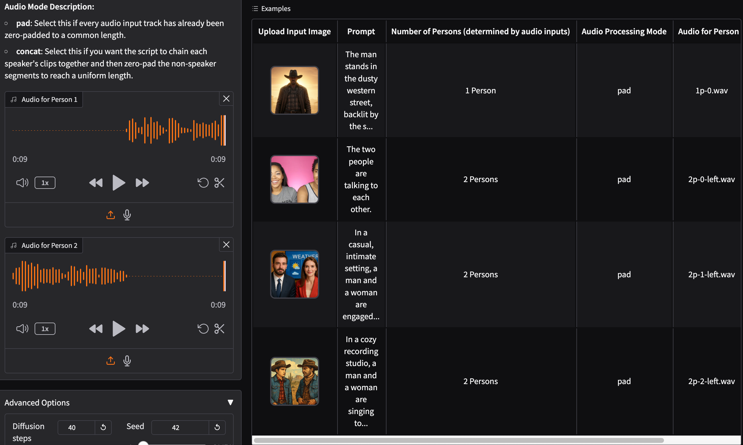 **Design Rationale**: Multi-person videos generally have longer duration and require more computational resources. To achieve better quality, especially for complex multi-person interactions, more denoising steps and longer GPU allocation time are needed. The Quality Mode dynamically allocates GPU time based on video length and denoising steps, while the Fast Mode offers a quick preview option with fixed 8 steps and a 4-second maximum duration for faster iteration.