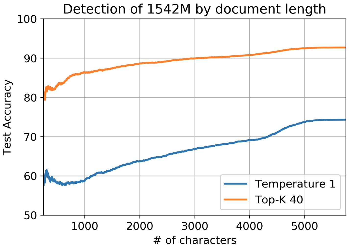 Unsurprisingly, shorter documents are harder to detect and performance improves gradually with length. Accuracy of detection of short documents of 500 characters (a long paragraph) is about 15% lower.